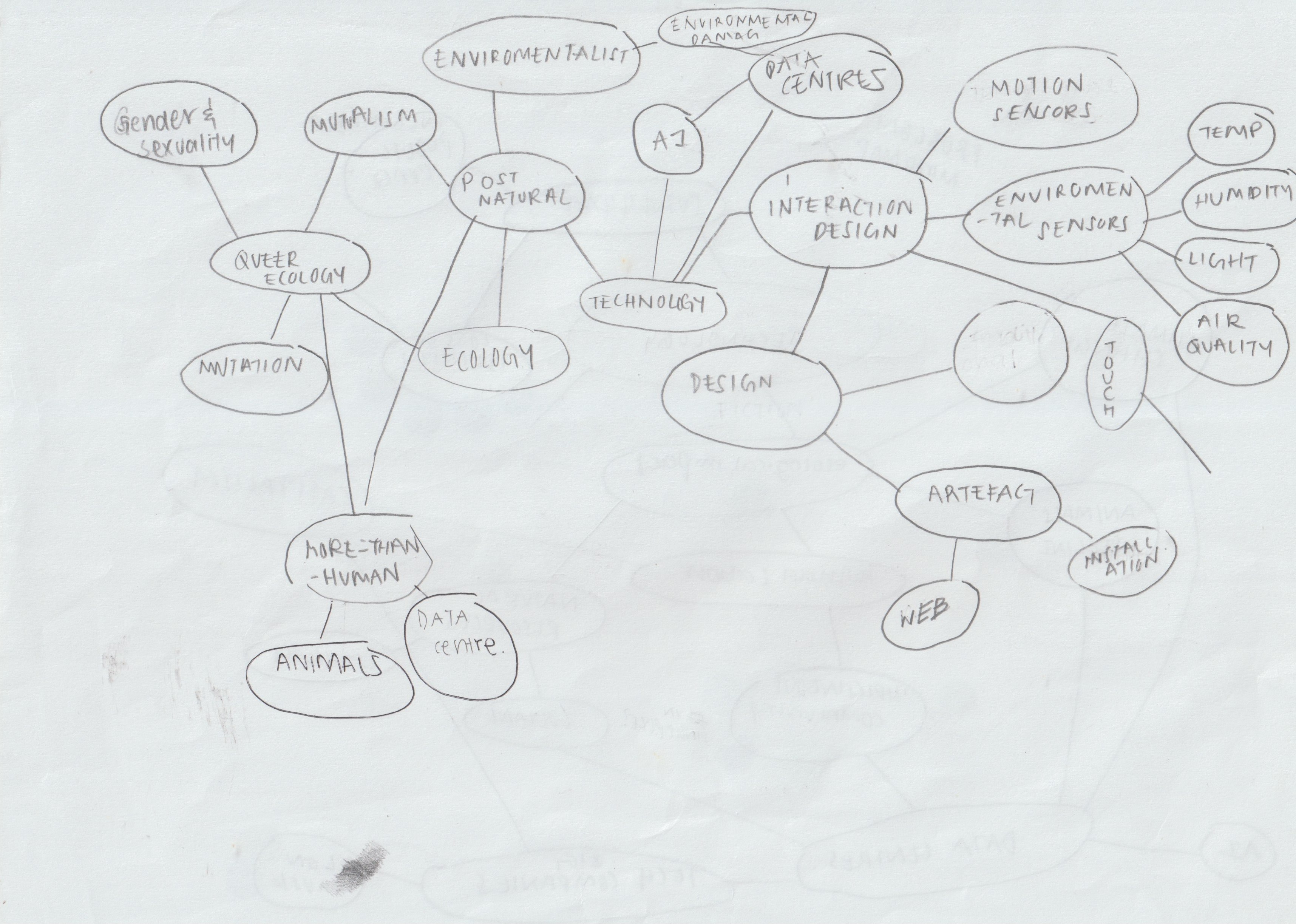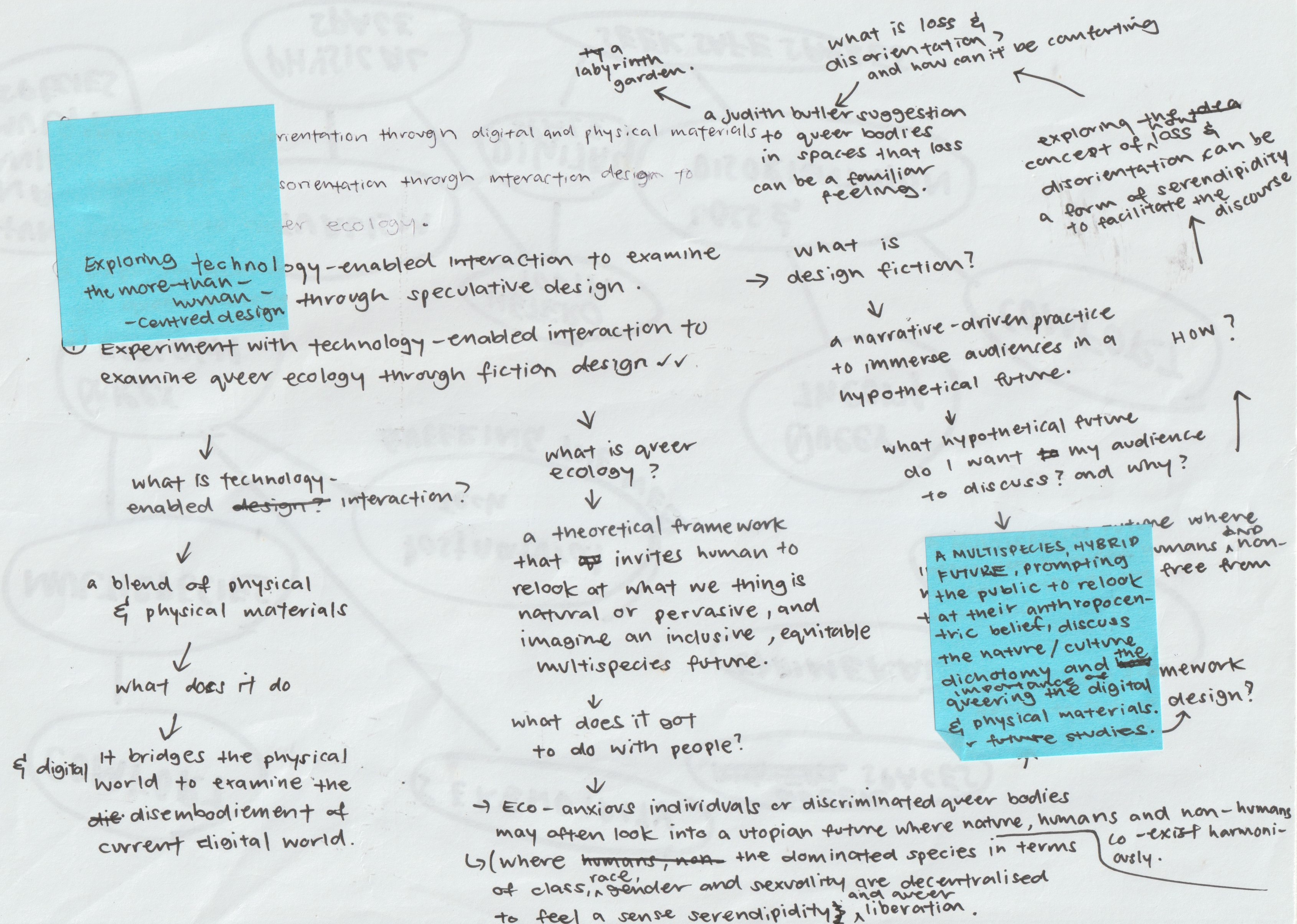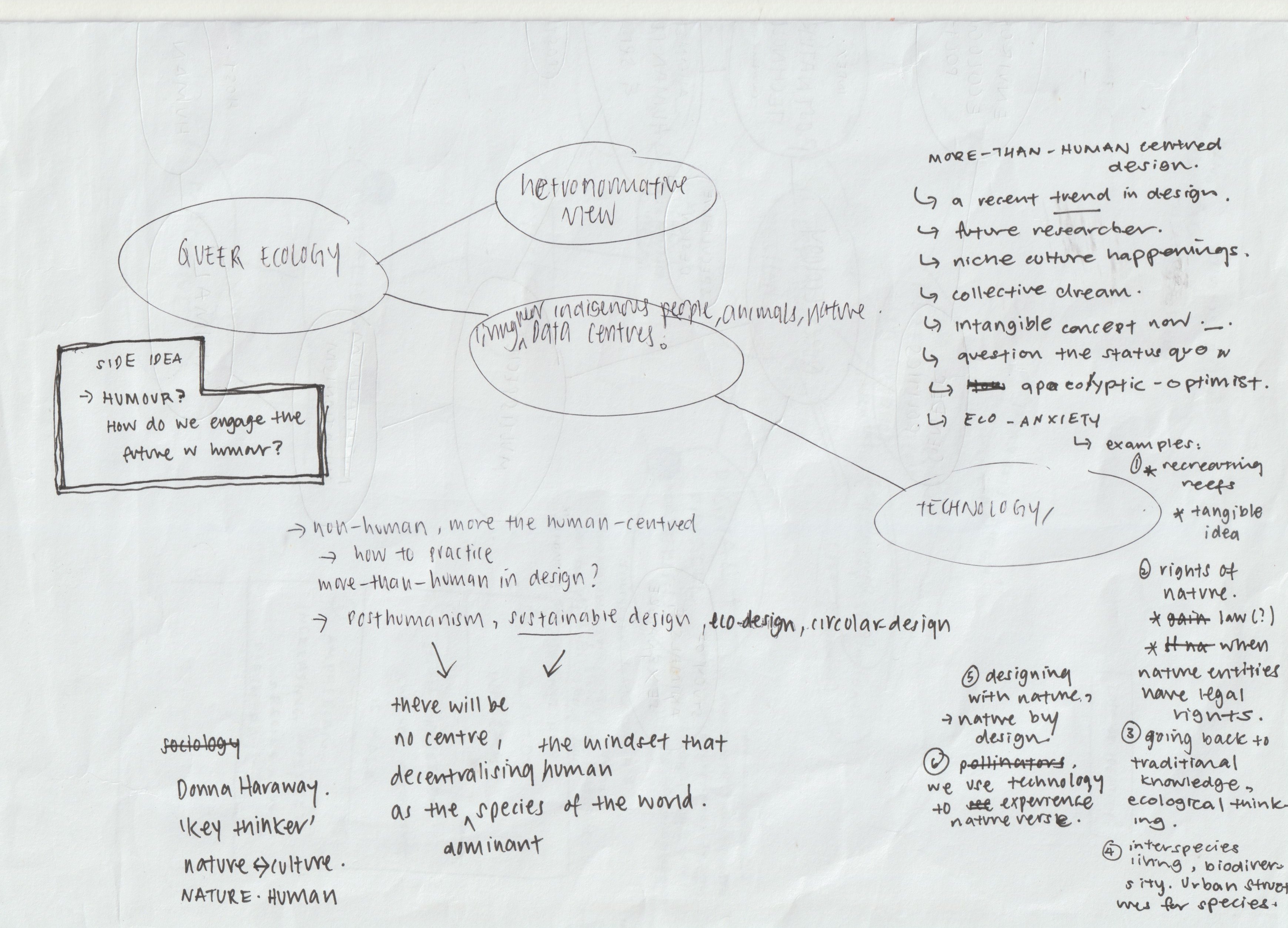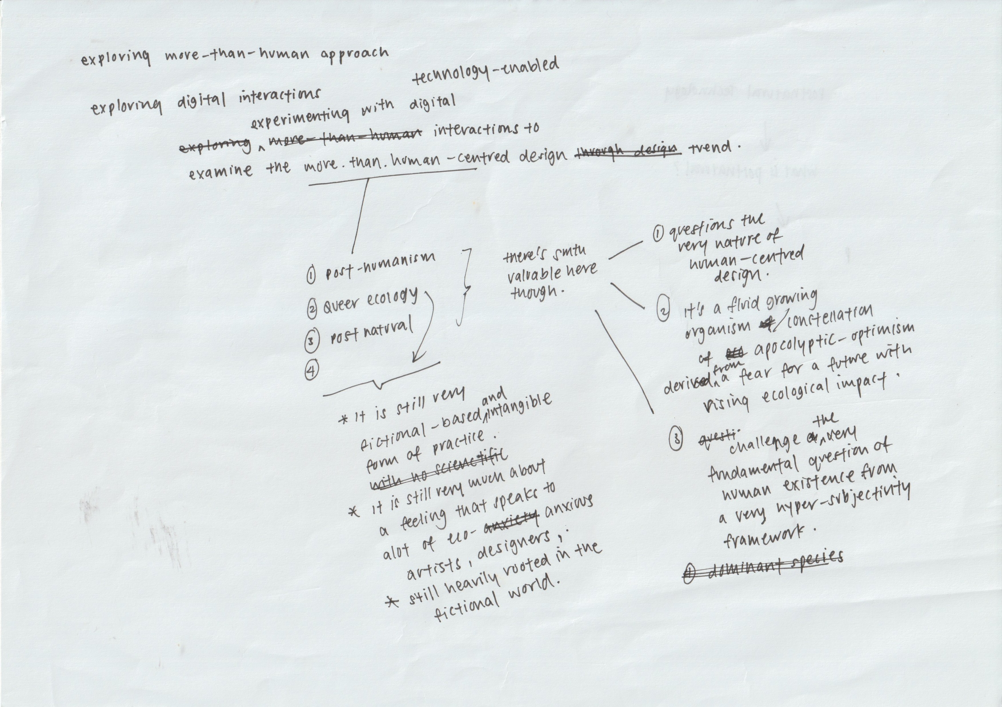 Next, I tried doing a mindmap again with some problems I identified, and it ended up becoming "Experimenting with technology-enabled interaction to examine queer ecology through fiction design." A multispecies hybrid future that prompts the public to revisit their anthropocentric beliefs and discuss the nature/culture dichotomy. (Future Zarer in week 7: damn, it’s crazy how many big words there are... What am I even talking about)