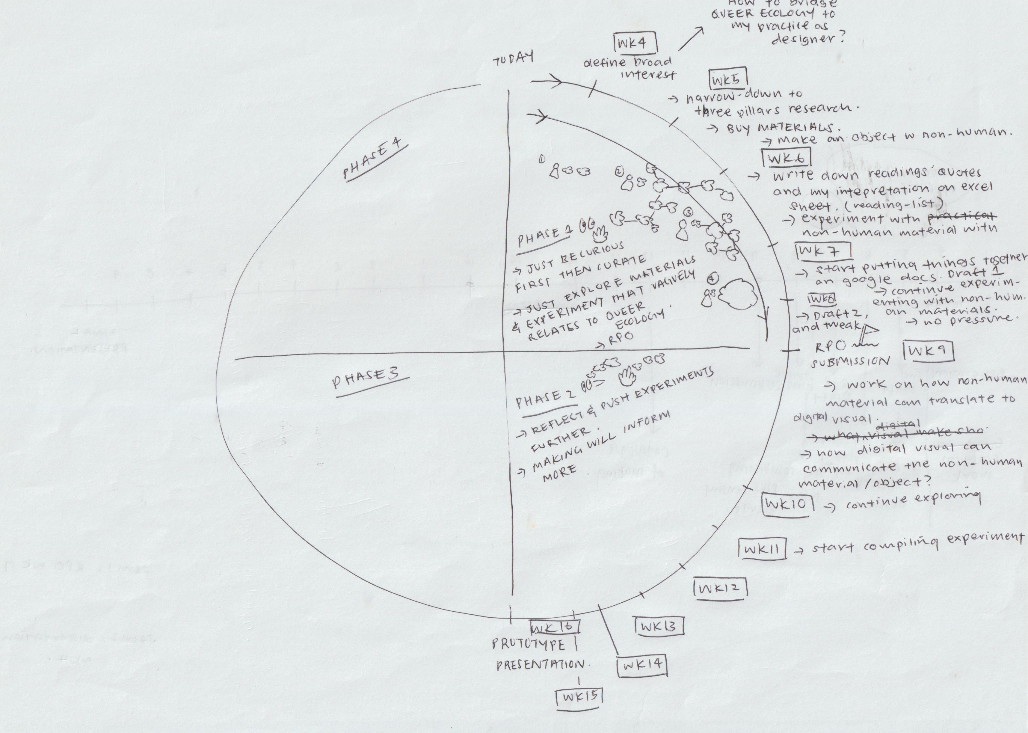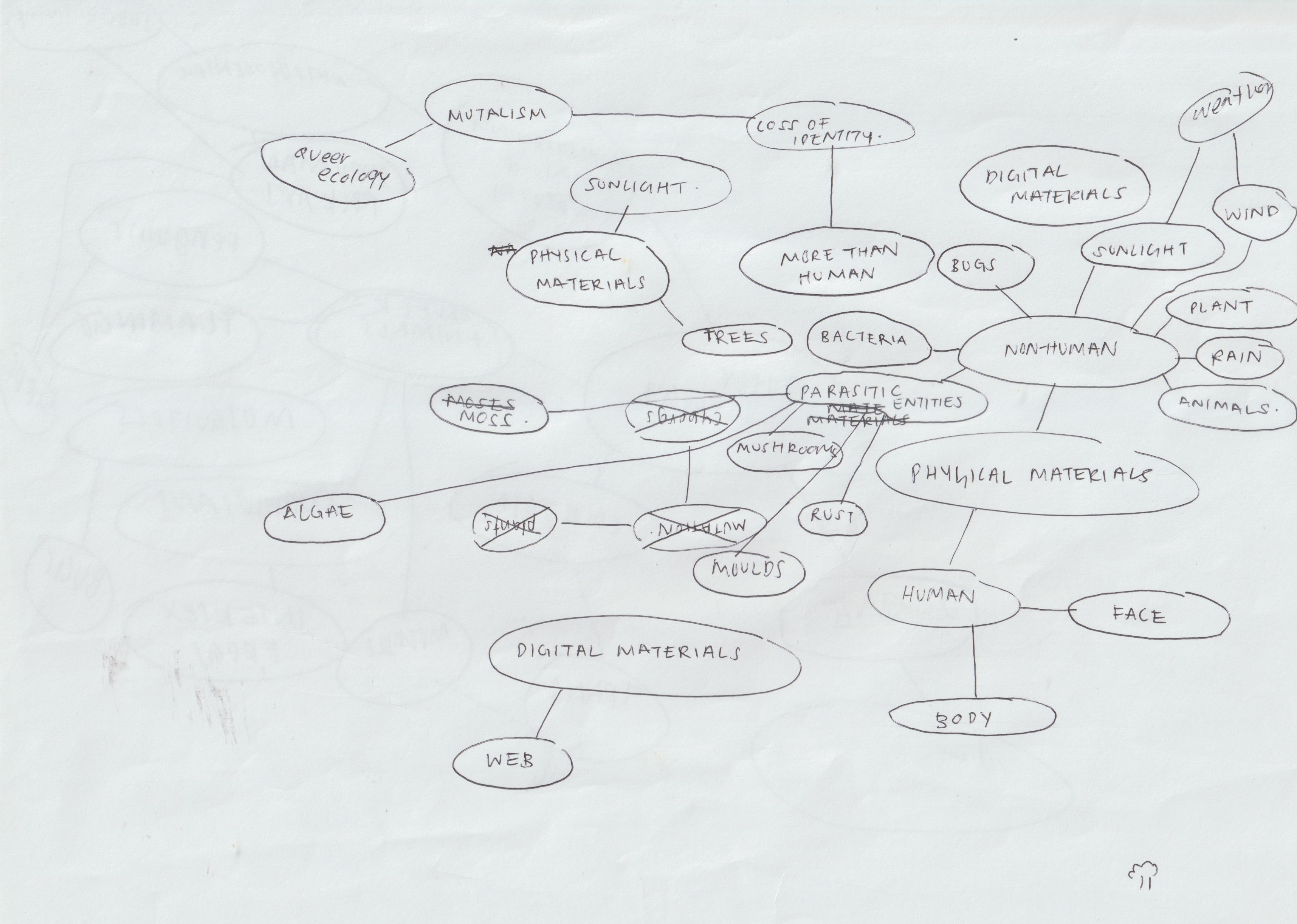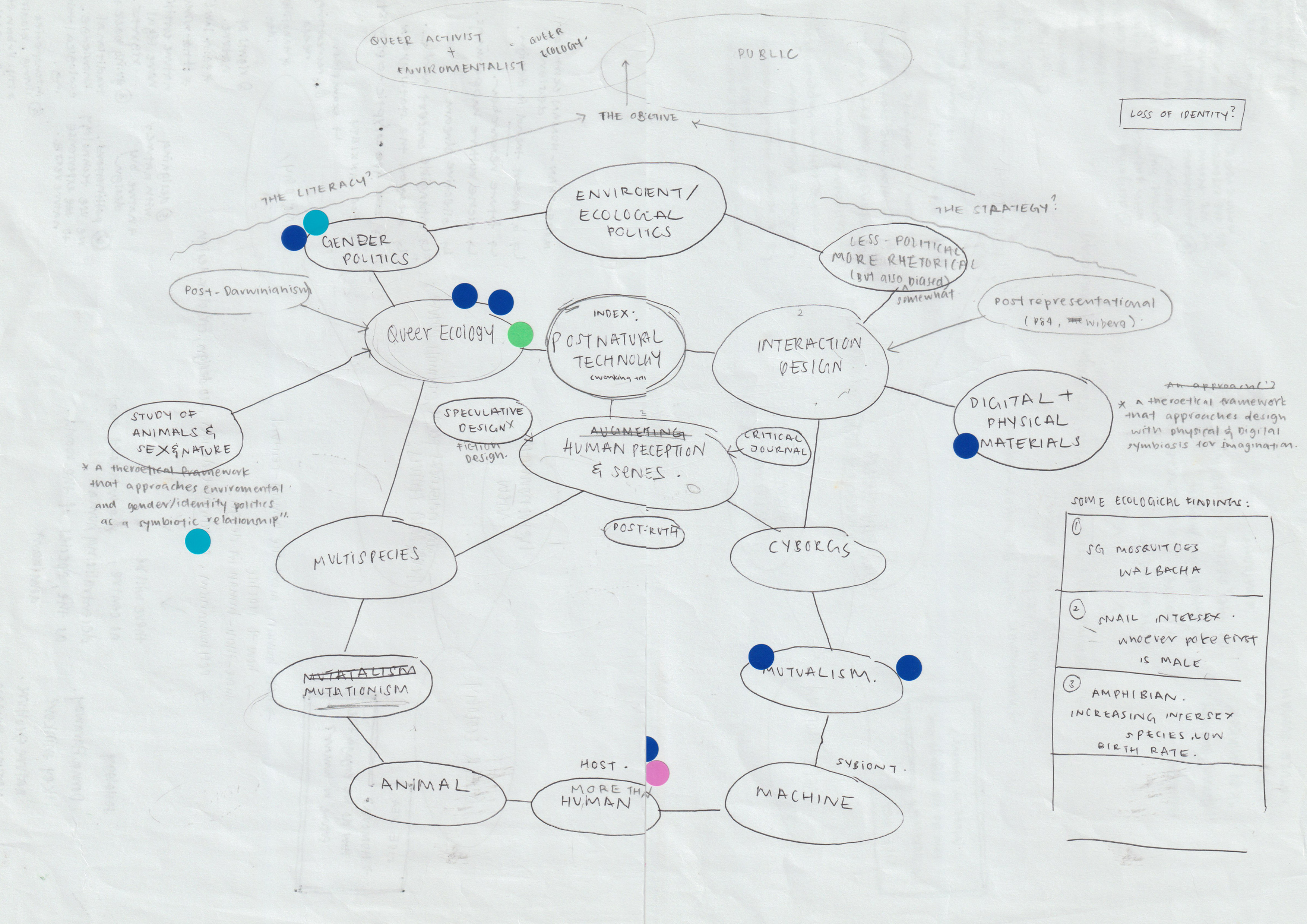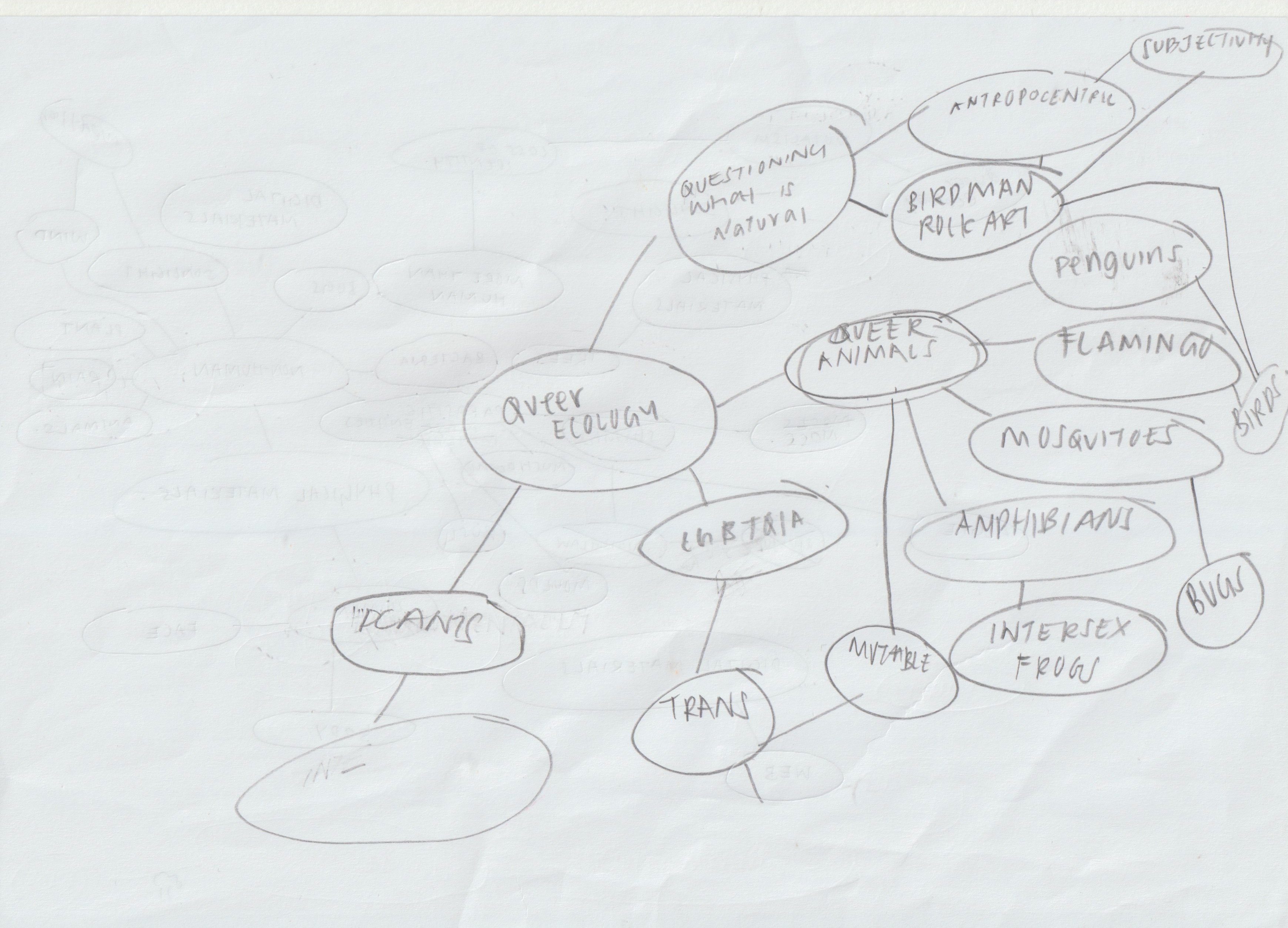 Next, I tried doing a mindmap again with some problems I identified, and it ended up becoming "Experimenting with technology-enabled interaction to examine queer ecology through fiction design." A multispecies hybrid future that prompts the public to revisit their anthropocentric beliefs and discuss the nature/culture dichotomy. (Future Zarer in week 7: damn, it’s crazy how many big words there are... What am I even talking about)