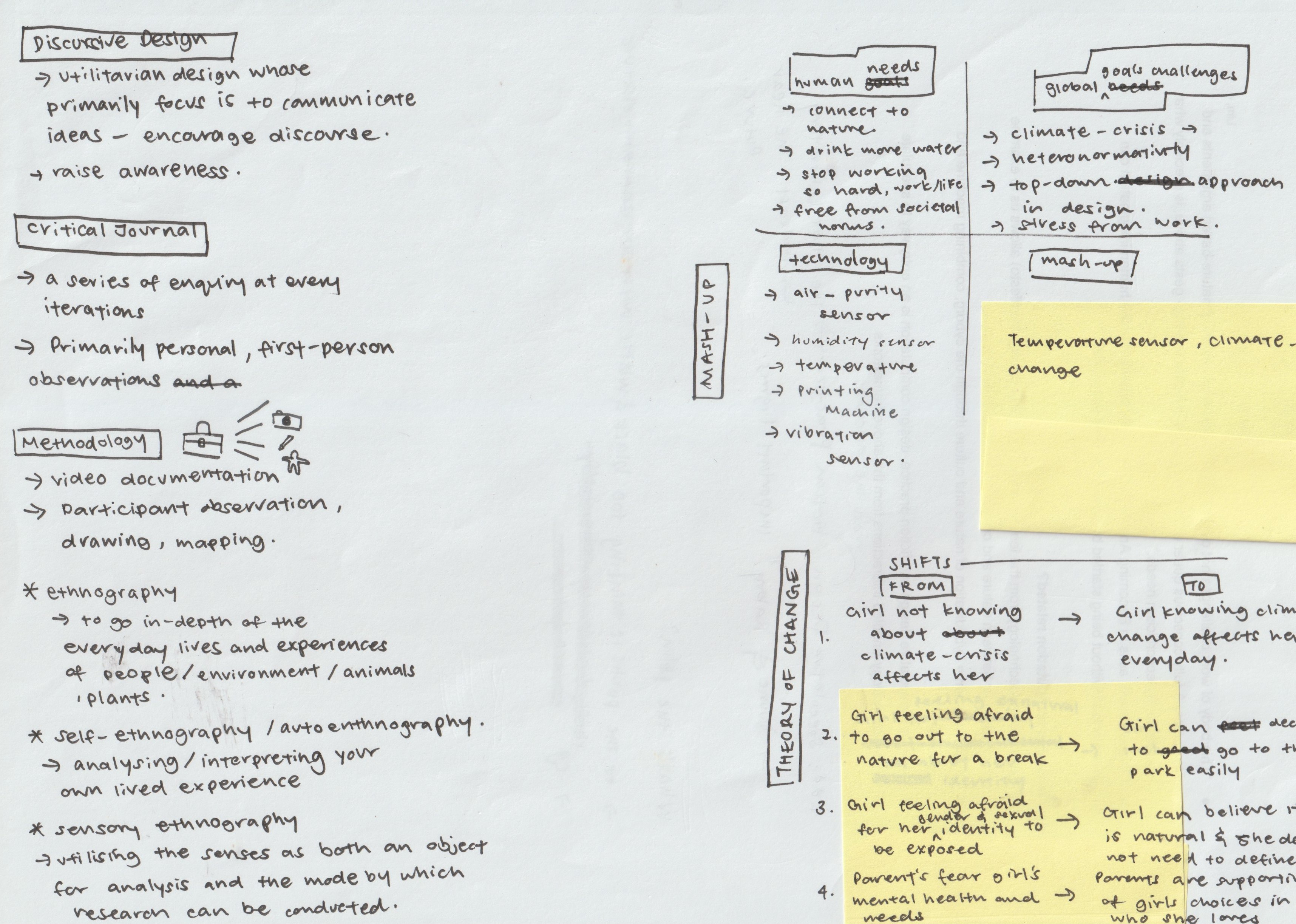 Next, I started reading up on the atelier’s resources on creating a research proposal outline and took notes on what I believe relates to my project. I also tried some of the research methodolgies from the Design Method Toolkit. In this first exercise called 'mash-up', I concluded that my problems were "humans need a break to be with nature", climate change is a global challenge, and the technology in question is sensors. Next, I tried the exercise theory of change, which identified the main shift in perception from a girl afraid to go out to nature for a break to knowing she can easily access nature.
