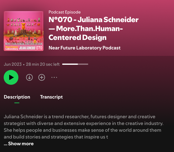 After this, I listened to a Near Future Laboratory Podcast with Juliana Schneider titled "More Than Human-Centred Design". I took down some notes. I identified with this approach, but I didn't know if it should be included in my research proposal outline at this point. Eitherway, it was quite a nice listen.