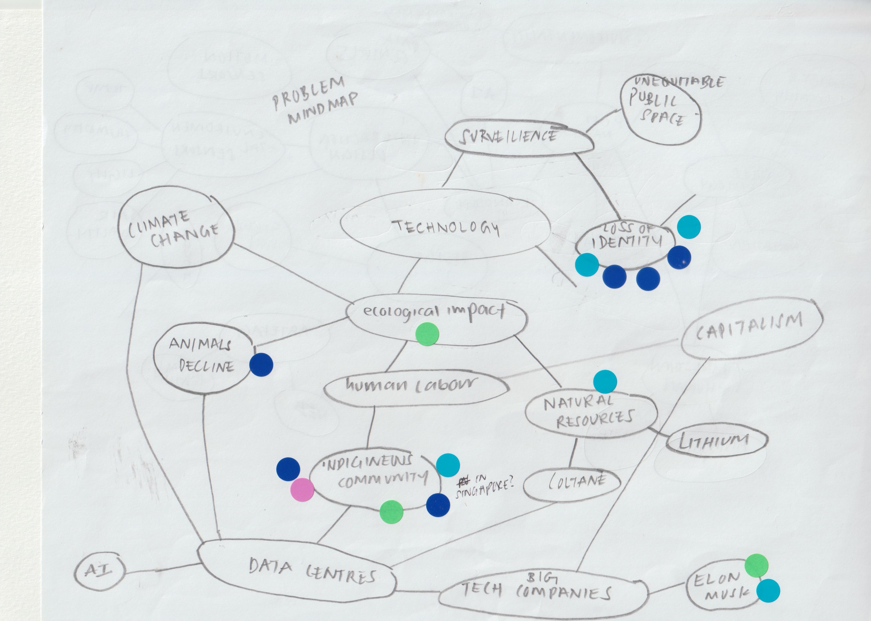 During class, the atelier went around and stuck a round sticker to the bubble that people resonated with the most. With five mindmaps, I presented two that made the most sense. The first one being a Mindmap and second being a 'Problem' Mindmap, which I will explain below: